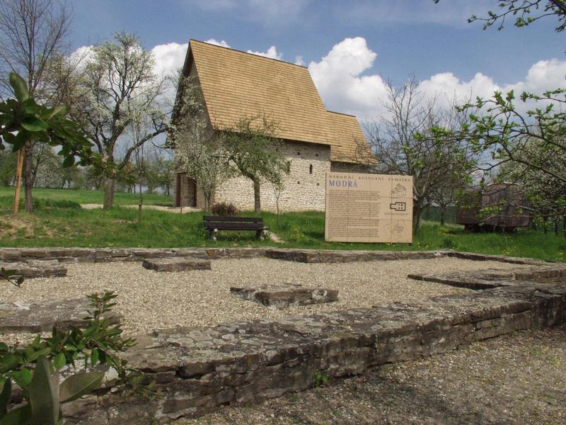 K lokalitě je možné se dostat po silnici vedoucí ze Starého Města do Velehradu. Lokalita se nachází na vyvýšenině náležející k předhůří Chřibů, 30 m nad lužní nivou při obchodní cestě, tzv. Staré hradské, spojující střední Pomoraví s Vyškovskem. Je situována nad Archeoskanzenem Modrá. Základové zdivo zdejšího kostela bylo objeveno již v roce 1911 J. Nevěřilem. Revizní archeologický výzkum na Modré provedlo v letech 1953 - 1954 Moravské muzeum v Brně. Výzkum plně prokázal velkomoravské stáří základů a navíc v jejich nejbližším okolí odkryl pohřebiště s 37 kostrovými hroby. Kostel byl založen ve 30. až 40. letech 9. století pod vlivem některého z misijních proudů přicházejících na Velkou Moravu ze západoevropských oblastí. Jednalo se o menší kostelík s obdélnou lodí (vnější rozměry 9,1 × 7 m) a pravoúhlým presbytářem (délka 4 m). Kolem kostela se pochovávalo v období od konce první poloviny 9. století do konce první poloviny století následujícího. U severní stěny kněžiště byly nalezeny také keramické střepy datované asi k přelomu 11. a 12. století. Na základě písemných zpráv se má zato, že v době budování blízkého cisterciáckého komplexu na Velehradě v 1. polovině 13. století plnil modranský kostelík funkci provizoria. Tehdy byla jeho loď doplněna čtyřmi vnitřními podpěrami. Definitivní zánik sakrální stavby je kladen před konec 17. století. Stavebně architektonické prvky rozebíraného kostelíka byly použity druhotně při stavbě domů od roku 1786 zakládané Nové Vsi - Modré. Návštěvníci mohou zhlédnout rekonstruovaný půdorys kostela, infomační tabule představuje historii a význam lokality. Nedaleko od místa, kde stával původní velkomoravský kostelík, dnes stojí i rekonstrukce jeho možného původního vzhledu ve skutečné velikosti.