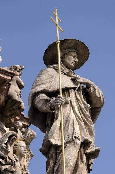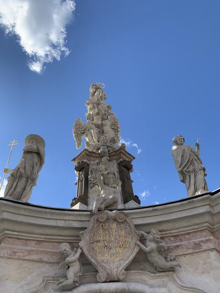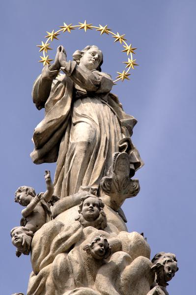 Sousoší tvoří mohutný čtyřboký sokl s volutovými pilíři na nárožích. Grottu na jeho čelní straně vyplňuje plastika sv. Rozálie, na nárožích jsou vápencové postavy významných františkánů a jezuitů, ochránců před morem (sv. Karel Boromejský, sv. Petr z Alcantry, sv. František Xaverský a sv. Florián). Na vrcholu sloupu je umístěna plastika tzv. Immaculaty (Panny Marie Neposkvrněná, prostovlasá), která v bohatě zřaseném plášti stojí na zeměkouli obtočené hady.