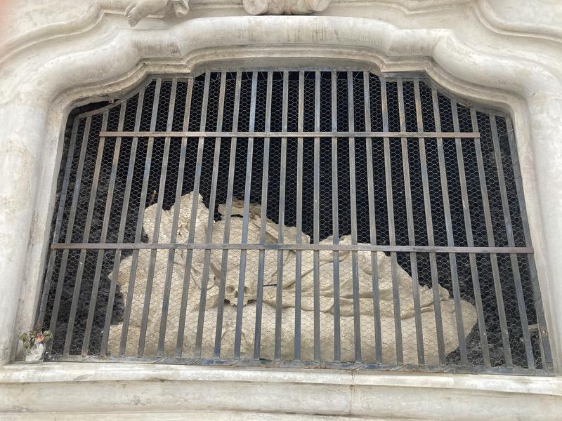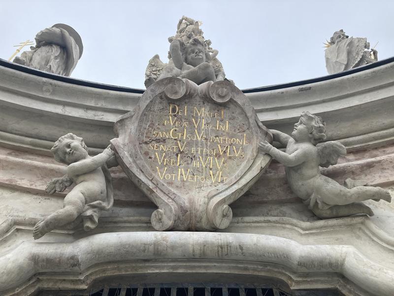 V kartuši nad grottou je latinský nápis s chronogramem. Připomíná slib postavit sloup, který dala městská rada, když obyvatele Uherského Hradiště postihla jedna z nejničivějších morových ran.