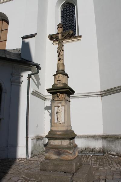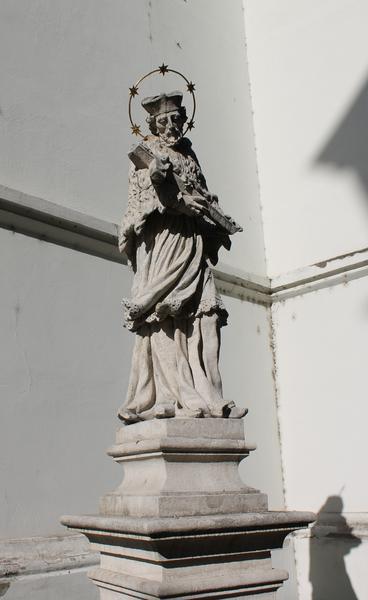 Při vchodu do kostela se nachází velký kamenný kříž z roku 1908. Svatý Jan Nepomucký původně stával pod obloukem tzv. Hradišťské brány u řeky Moravy. Tato vzácná empírová památka byla ale v důsledku regulace často rozvodněné řeky na začátku 20. století stržena a socha sv. Jana Nepomuckého přemístěna na Tyršovo náměstí. Po válce se rozhodlo o definitivní poloze slavného českého zemského patrona u kostela Nanebevzetí Panny Marie.