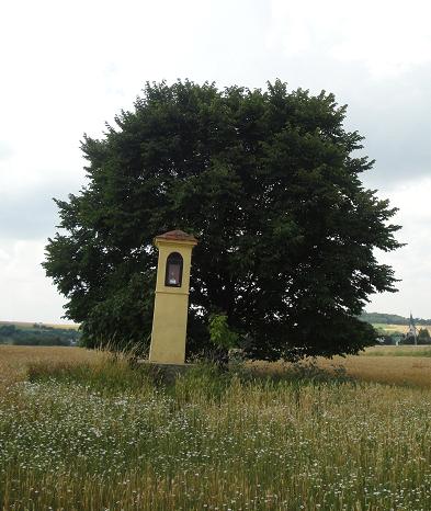 Za hřbitovem, v polích, se nachází čtyřboká hranolová stavba se čtyřmi nikami se souškou sv. Josefa Pěstouna. Na střeše je umístěn jednoramenný kovaný kříž.