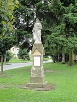 Socha Krista držící se levou rukou za srdce stojí na návsi v parku.
