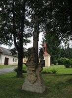 Pozdně barokní kříž se skládá z podstavce s římsou, nástavce, čepu a kříže. Kolem nástavce na římse jsou umístěny tři sochy v podživotní velikosti – po pravé straně je to sv. Hubert jako patron řezníků, nalevo sv. Vendelín s hlavou ovečky u pravé nohy a uprostřed P. Marie.