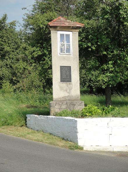 Čtyřhranná stavba, ve předu prosklená nika se sochou Ježíše Krista a žulová deska s textem.