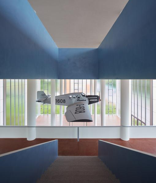 Čeká vás mimořádný zážitek umocněný věrnou maketou Baťova letounu Junkers F-13. Výrazným prvkem interiéru je schodiště ve tvaru písmene Z - Zlín. Součástí mobiliáře jsou také tzv. loučové lampy Luminator, které jsou nově vyrobeny přesně podle původních lamp. Budova ze skla, betonu a kovu je unikátní v každé denní době a za každého ročního období.