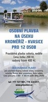 Využijte naši novou loď Bruno k vyhlídkové projížďce v Kroměříži na řece Moravě. Kapacita lodě je 12 osob. Nástup na Erbenově nábřeží. Základní okruh: Kroměříž - Kvasice - Kroměříž trasa měří 18 km, plavba trvá okolo 2,5 hodin palubní lístek 200,- Kč / osobu, rodinný lístek 400,- Kč Startuje se každý pátek, sobotu a neděli od června do září vždy v 10.00 hodin z kroměřížského přístaviště na Erbenově nábřeží. Objednávkové okruhy Kroměříž - Kvasice - Kroměříž trasa měří 18 km, plavba trvá okolo 2,5 hodin pronájem celé lodi 2000,- Kč Kroměříž - Kvasice - Bělov - Kroměříž trasa měří 24 km, trvá okolo 3 hodin pronájem celé lodi 3000,- Kč