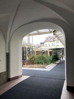 Hlavní průčelí do náměstí 2+2+2 okenní osy, které odděleny průběžným pilastrem se zdobenou kompozitní hlavicí.. Okna pravoúhlá s parapetní římsou a s nadokenní řimsou. Horizontálně je fasáda členěna na přízemí, v němž spodní část pilastrů pilastůy bosovaná, oddělené od prvního patra profilovanou kordonovou římsou. V přízemí je proražen průjezd, po levé straně dvě okna bez parapetů a nadokenních říms, po pravé straně výklad se vchodem do obchodu. Korounní římsa profilovaná, na konzolách, mezi nimi motiv pseodogotické kružby. Stavba zastřešena sedlovou střechou.