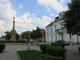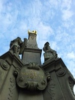 Sloup se sochou Panny Marie s Ježíškem zdobí na vyvýšeném podstavci další čtyři plastiky: svatý Florián, který měl (a má) město chránit před škodami způsobenými ohněm, svatý Vendelín, ochránce polí a dobytka, který bdí nad rolníky a pastýři, svatá Tekla, tradičně první křesťanská mučednice, která se věnovala léčení bližních, a archanděl Rafael s malým - Tobiášem. Archanděl Rafael chránil poutníky a další cestující (ostatně, kloboučtí soukeníci vozili své zboží po celých Uhrách). V obrazech renesanční Itálie často připomínala plátna s Rafaelem a Tobiášem odchod syna z rodiny, Tobiáš obvykle míval synovu podobu. Nemyslím, že by Tobiášova socha představovala podobu donátorova syna (Tobiáše), ale je zjevné, že jde o připomenutí osoby donátora. Na mariánském sloupu čteme nápis „PANNO MOCNA ORODVG ZA NAS KLOBVCKI“ (tučně zaznačená písmena označují údaje chronogramu).