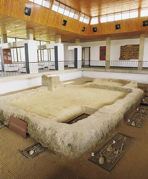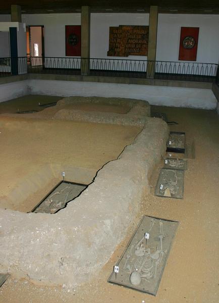 Zrekonstruovaný půdorys velkomoravského kostela z poloviny 9. století, v jehož okolí bylo odkryto také pohřebiště.