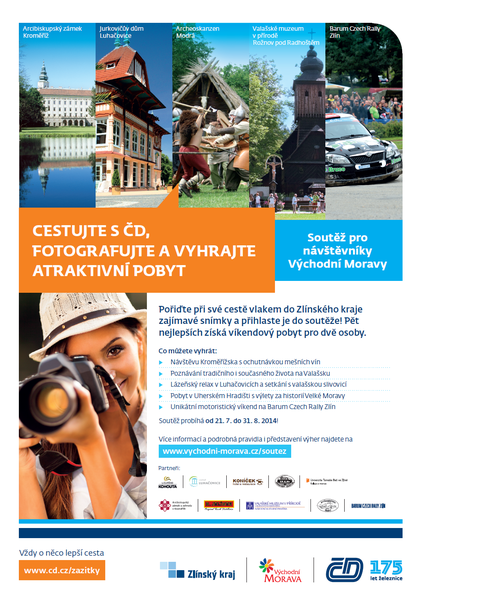 Letní měsíce jsou ideálním časem pro výlety a dovolenou. V letošním roce jsme pro vás připravili letní fotografickou soutěž. Zašlete nám v době od 21. července do 31. srpna 2014 fotku z výletu či dovolené na Východní Moravě (Zlínský kraj), na kterou jste cestovali vlakem. Pokud se vám podaří jedinečná fotka, neváhejte a přihlaste ji do letní fotografické soutěže S Českými drahami na Východní Moravu. Snímky z výletu vlakem či dovolené, na níž jste přijeli po kolejích, pořízené v regionu Východní Morava (Zlínském kraji) zasílejte od 21. července do 31. srpna 2014 na e-mailovou adresu info@vychodni-morava.cz. Pravidla soutěže najdete zde. Pět nejvydařenějších fotek bude odbornou porotou odměněno víkendovým pobytem pro dvě osoby na Východní Moravě a volnou vstupenkou do turistického cíle Východní Moravy.