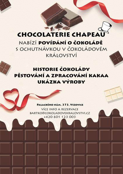 Chocolaterie Chapeau nabízí povídání o čokoládě s ochutnávkou v čokoládovém království. Historie čokolády - pěstování a zpracování kakaa - ukázka výroby.