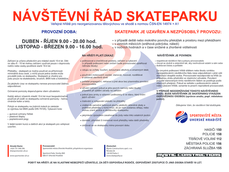 Skatepark byl otevřen v roce 2021 a slouží k jízdě na skateboardu, koloběžkách, in line bruslích i na BMX kolech. Areál zahrnuje vybavení prostoru stojany na kola, lavičkami, odpadkovými koši či informačním panelem s mapou a směrovníky. Provozní doba: duben - říjen 9:00 - 20:00, listopad - březen 9:00 - 16:00.