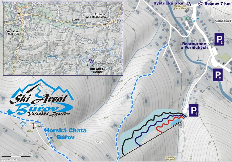 SKI AREÁL BÚŘOV se nachází v malebném prostředí Beskyd v obci Valašská Bystřice, která je vzdálená 7 km od Rožnova pod Radhoštěm. Areál je vhodný pro začínajíce a pokročilé lyžaře. Je ideální pro lyžařské kurzy, hodně je navštěvován také snowbordisty, pro které je zřízen snowpark.Nadmořská výška vleků je 500 - 620 m.n.m. Na hlavní a dětské sjezdovce je nainstalován zasněžovací systém se třemi sněžnými děly Areco. Výkonné osvětlení zajišťuje komfortní večerní lyžování. Denní úprava povrchu se provádí strojem Prinoth Big.