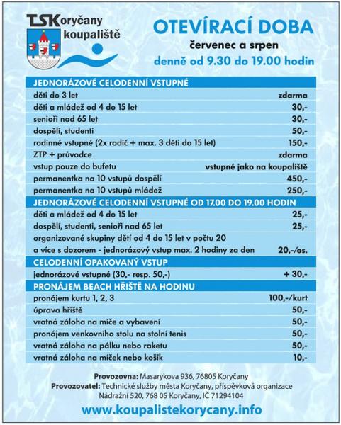 Ke koupání jsou k dispozici 2 bazény. Bazén pro plavce o rozměrech 50 x 21 x 1,3 m s průměrnou teplotou vody 22 ºC. Malé brouzdaliště pro děti o rozměrech 7,7 x 12 x 0,3 m s průměrnou teplotou vody 22 °C. Dále máme k dispozici 3 beachvolejbalové hřiště pro individuální využití, plochu pro odpočinek a sportovní aktivitu 12 000 m² a volné WIFI připojení.