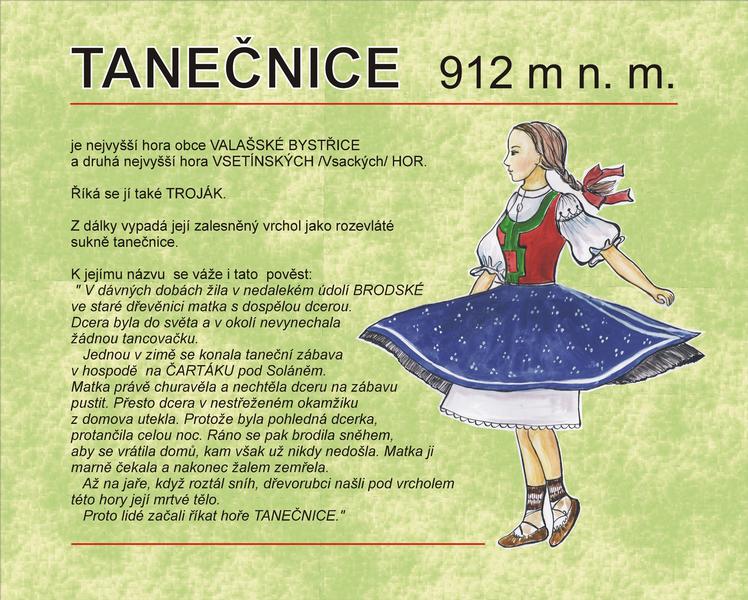Nejvhodnější cesta je od hospody U Pernických po červené značce směrem na Hážovické díly ( zde jsou pěkné výhledy ). Pokračovat po modré značce kolem Mísné – Heralky až na rozcestí pod Tanečnicí. Délka trasy je cca 9km. Tanečnice je největší hora Valašské Bystřice a druhá nejvyšší hora Vsetínských hor. U křižovatky cest je památník členům odboje 2.světové války, kteří tímto místem procházeli. Vrchol hory je 50m nad turistickou cestou.