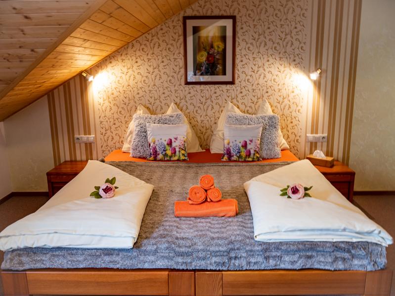 Dvoulůžkový pokoj Standard - Podkrovní pokoj, který je vybavený manželskou postelí, moderním nábytkem z masivu, TV. Designová koupelna se sprchovým koutem je součástí pokoje. Pokoj je vhodný pro ty, kteří dávají přednost soukromí. Všechny lůžka lze rozdělit na double nebo twin. Na tyto pokoje lze přidat postýlku nebo přistýlku pro Vaše děti.