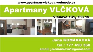 Nabízíme ubytování ve dvou soukromých luxusně vybavených apartmánech nedaleko krajského města Zlína. Ubytování v našich apartmánech se nachází v centru malé obce Vlčková, která leží 15 kilometrů severovýchodně od krajského města Zlína a 4 km od jedné z nejkrásnějších zoologických zahrad v České republice - ZOO Lešná. Spojení s městem obstarává pravidelná autobusová linka.