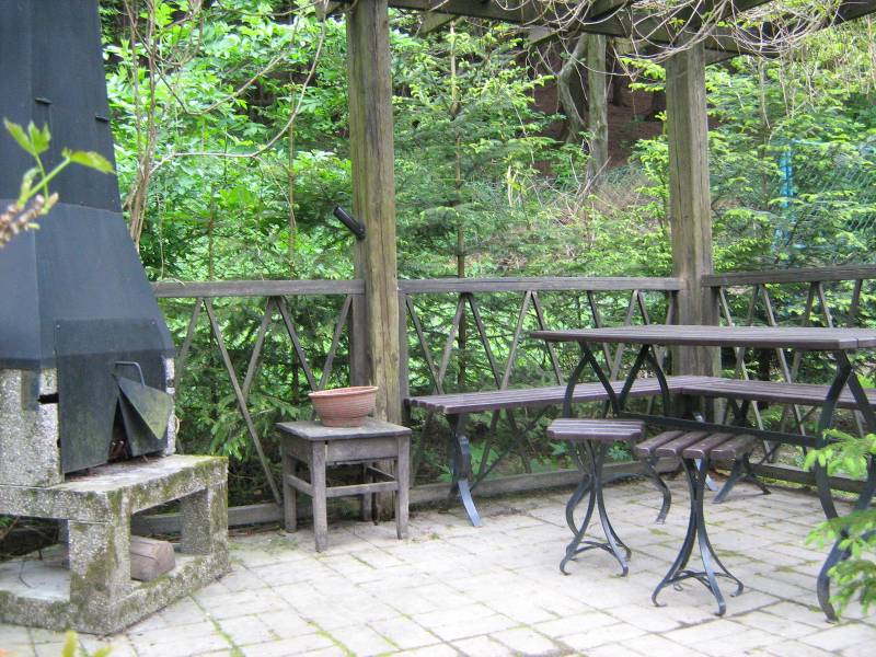 K dipozici je oplocený velký pozemek s parkovištěm, venkovním posezením v
