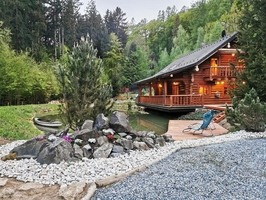 vybavená kuchyň, 2 koupelny, parkování pro 6 aut, v pokojích TV, ve společenské místnosti TV, krb a kulečník, dětské hřiště, rybník